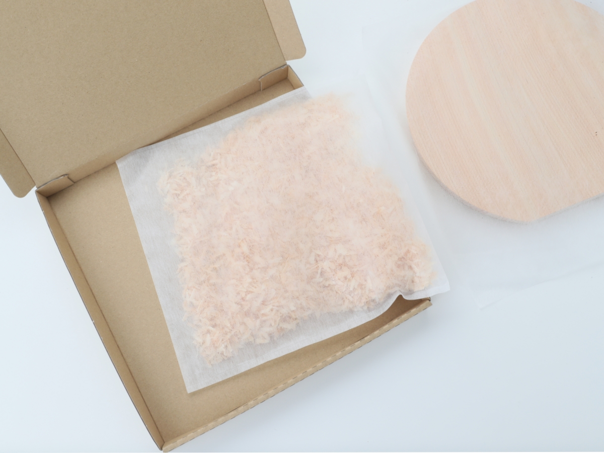 プラスチック製の緩衝材の代わりに、ヒノキのかんなくずを使用することで、脱プラスチックを実現。さらに、この切り替えによって年間約90%の梱包コスト削減にも成功し、「環境への配慮」と「経済性」を無理なく両立しました。