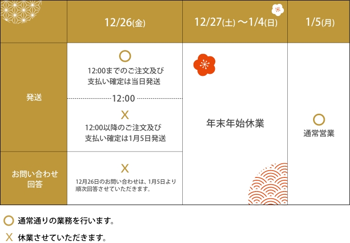 休業中にいただきましたお問い合わせは、1月5日(月)より順次対応させていただきます。